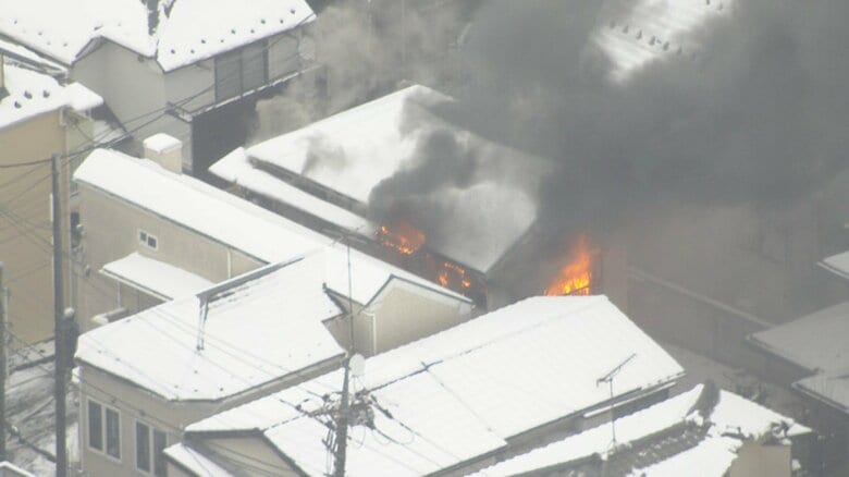 火災発生直後の現場上空の映像では、雪に覆われた建物から白い煙が立ち上り、時おり赤い炎が出ていた。